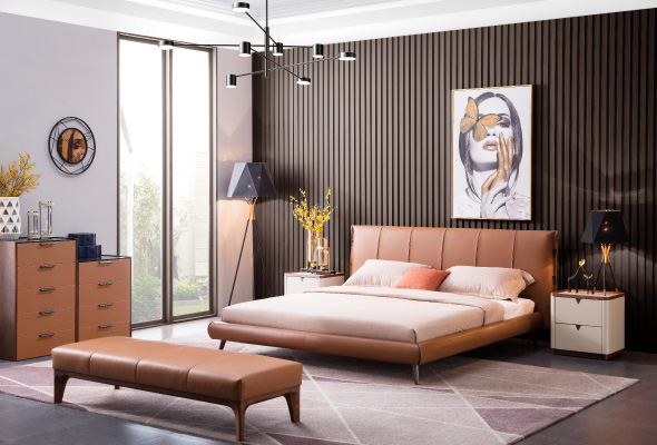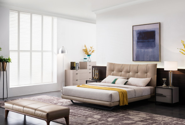 典型的歐式奢華風格,使用進口頂級頭層牛皮,質感柔細,透氣性、耐用性及抗拉性較佳;床頭左右兩側邊緣搭配垂直蝴蝶扣環,在褐色調中加入跳色的小巧思;床底為內崁式設計,因此不會有床墊滑動的問題;獨特的鍍鈦髮絲紋床腳,穩固耐用之外,承重度也較高。Otis奧狄斯擁有華麗的黃金比例和奢華的工藝細節,強力推薦給喜好大氣繁複風格的你。