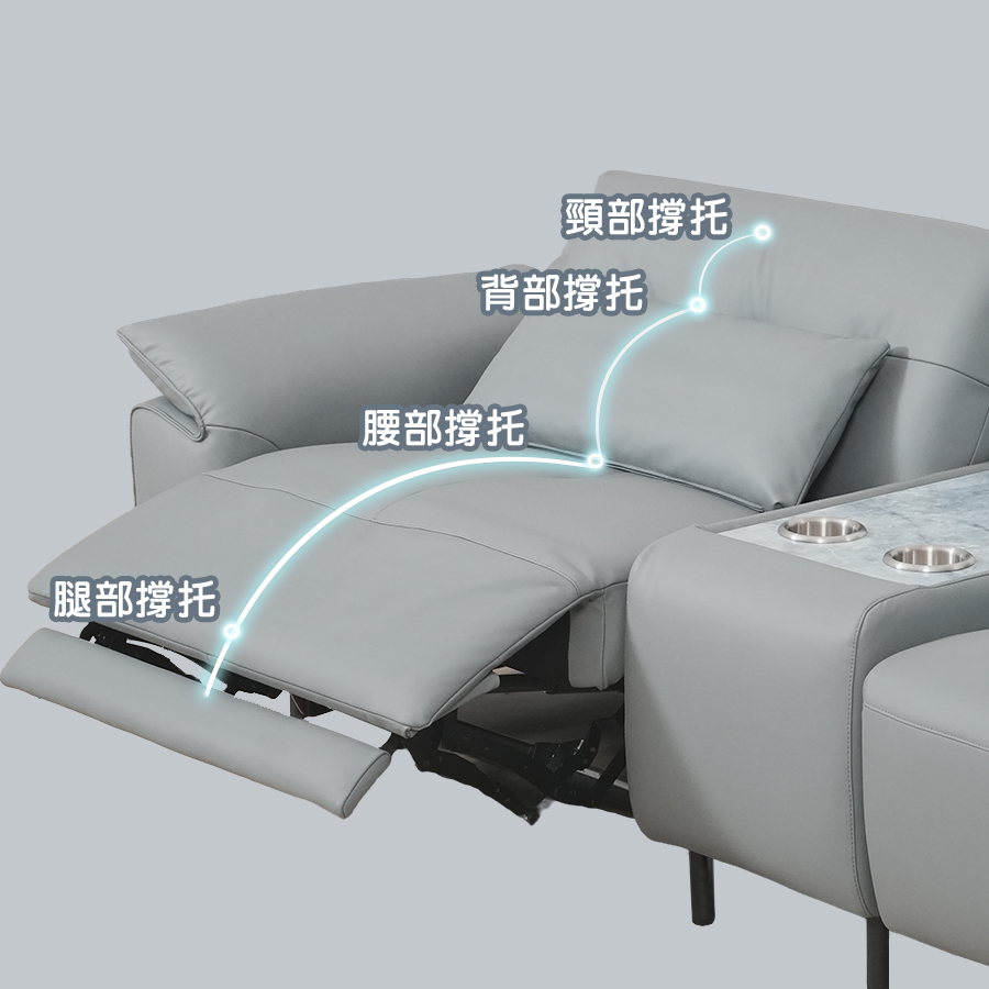 使用全方位人體工學設計,頸部、背部、腰部、腿部皆能獲得充足支撐,搭配多段角度扶手,完美釋放全身壓力