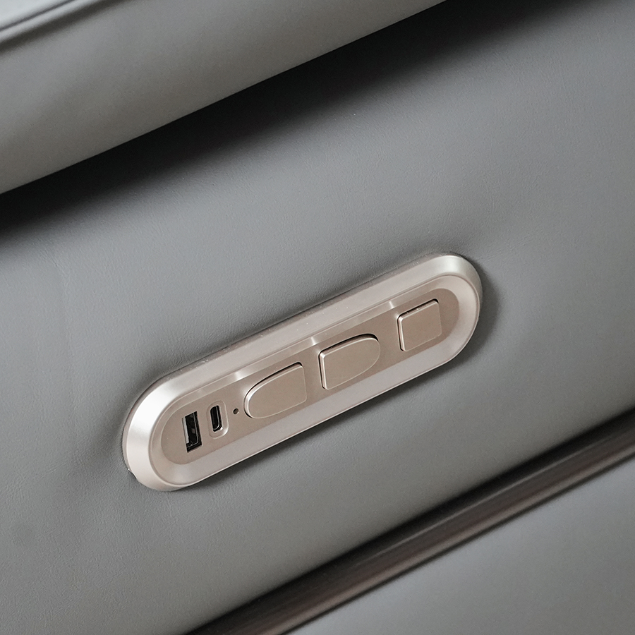 配有一鍵調整傾仰角度,讓舒適度達到極致,搭配高承重力的碳素鋼電動支架,開合順滑,超靜音且不易生鏽,保證耐用性和安全性。扶手側邊設有USB雙插口設計,隨插即用,即時充電。