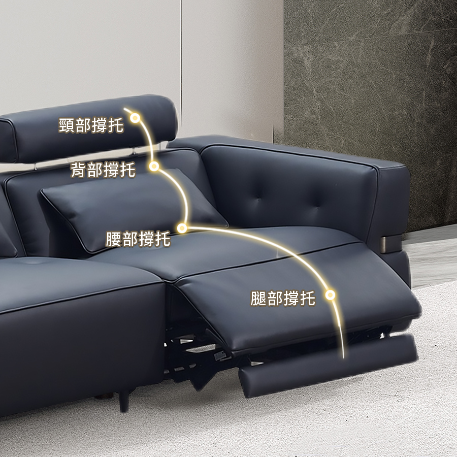 採用頭部及身體電動調節模式,以全方位人體工學設計,頭部、頸部、背部、腰部、腿部皆能獲得完整的撐托,適當釋放全身壓力。