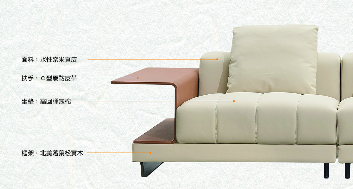 水性奈米真皮擁有真皮的觸感,細膩整齊的紋路,耐磨、耐刮、極強的防水材質,不含甲醛等有害成分,確保居家健康安全。透過創新技術,水性奈米真皮不僅延長皮革的使用壽命,更能滿足喜愛真皮觸感的消費者需求。尤其適合家中有養寵物的朋友或是有學齡前的孩童,這種材質的家具商品在耐用性、觸感舒適度以及環保特性方面都表現卓越。水性真皮/牛皮無疑是未來家具市場中的新時尚,提供一個健康、環保且高品質的選擇。