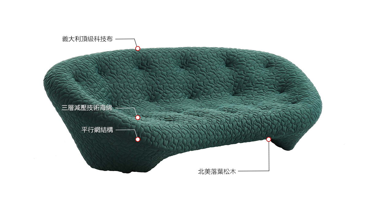 奢華的舒適度,採用擁有記憶特性的三種不同密度超高彈性泡棉填充,無論平坐、躺臥、側臥,任何姿勢都能享受到其舒適度,它的座位相對較低,無論是坐下還是躺下,很容易就能找到一個舒適的角度。