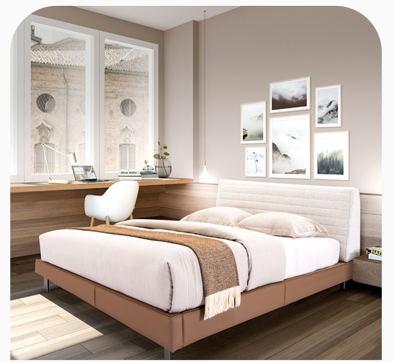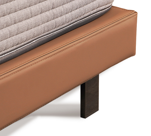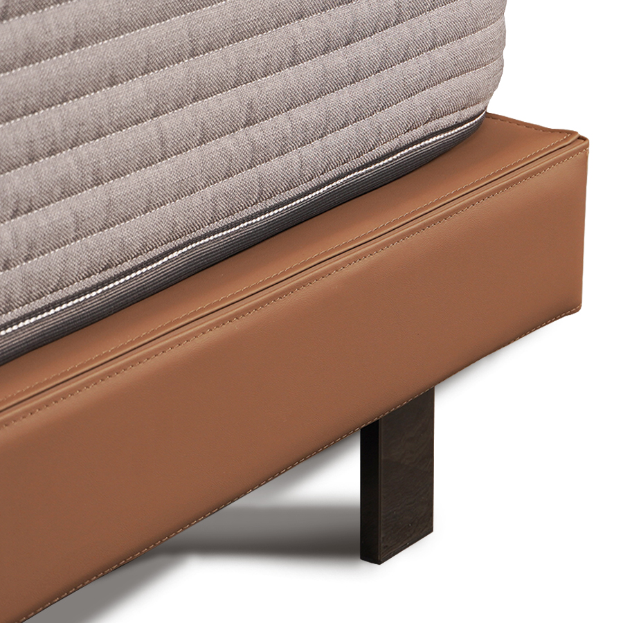 精雕細琢地手工縫線懸浮式平台底座採用精湛車縫設計,義大利牛皮與布藝配飾,床底外型採用頂級皮革工藝設計而成。