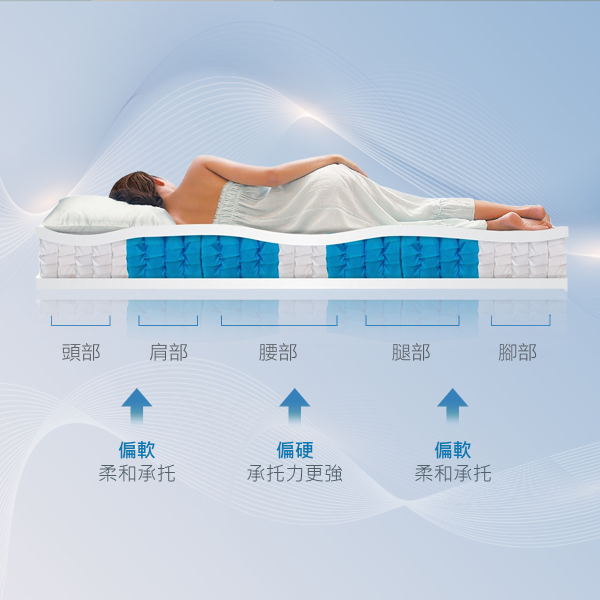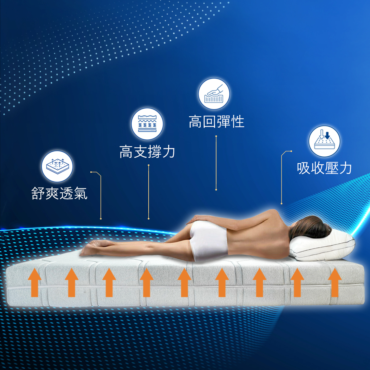 科技立體結構,不會讓身體下沉,能夠根據人體各部位的受力面積提供不同的支撐,貼合人體S曲線,不會受到不當壓力而變形,有效減緩身體負擔,尤其在脊椎、腰部、臀部、腿等部位,幫助骨骼放鬆緩解壓力,有效幫助深度睡眠。