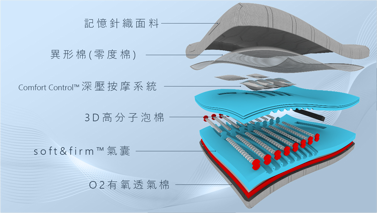 異形棉(零度棉) 以3D列印模型的先進技術完全革新了傳統床墊的結構,在發生壓力不平衡時感知壓力不平衡,並即時默默調整,為處於不同體態與任何睡姿的任何人,呈現零壓力提供個性化的完美支撐,同時特別強調頭頸、腰部和臀部的支撐區域,為每個使用者提供最貼合的睡眠體驗。其組織由MDI發泡而成的海棉,擁有奈米微孔結構,使得空氣得以循環流動,全面性的釋放身體壓力,透氣吸濕性極佳,這項技術讓床墊更家輕巧和高度彈性、柔韌性的特性,提供均衡的支撐力,確保身體保持良好的姿勢。