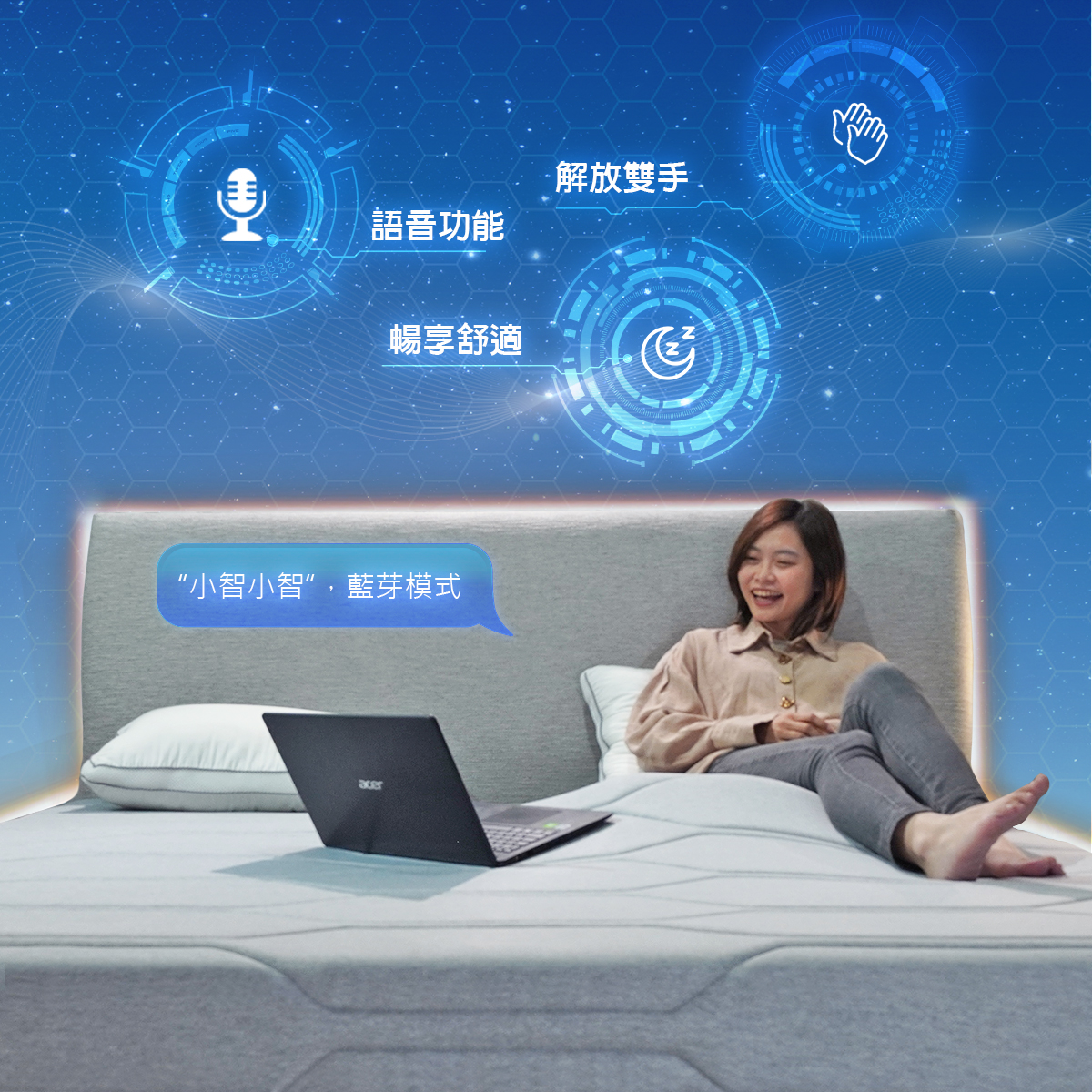 使用者只需以口頭命令喚醒「小智」,即可掌握床墊的所有強大功能。包含左右軟硬度的即時調整、按摩模式,能夠在不動手的情況下獲得最佳的支撐感,以及能夠連結藍芽等更多功能,讓您在享受舒適的同時,實現雙手的解放。