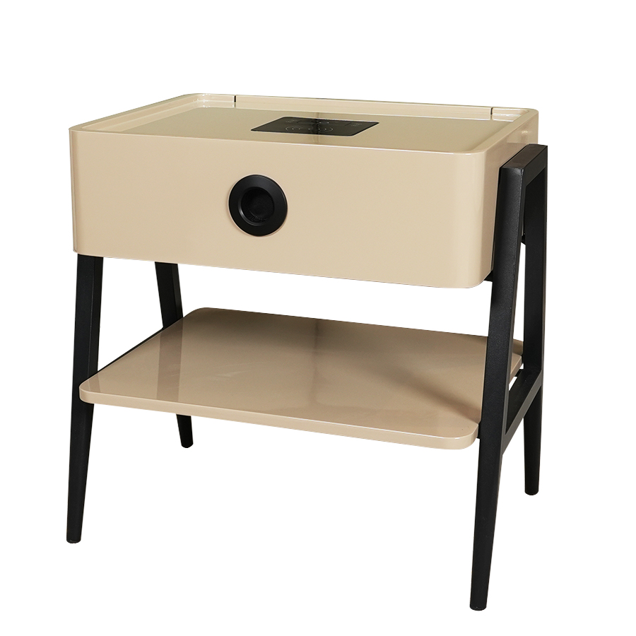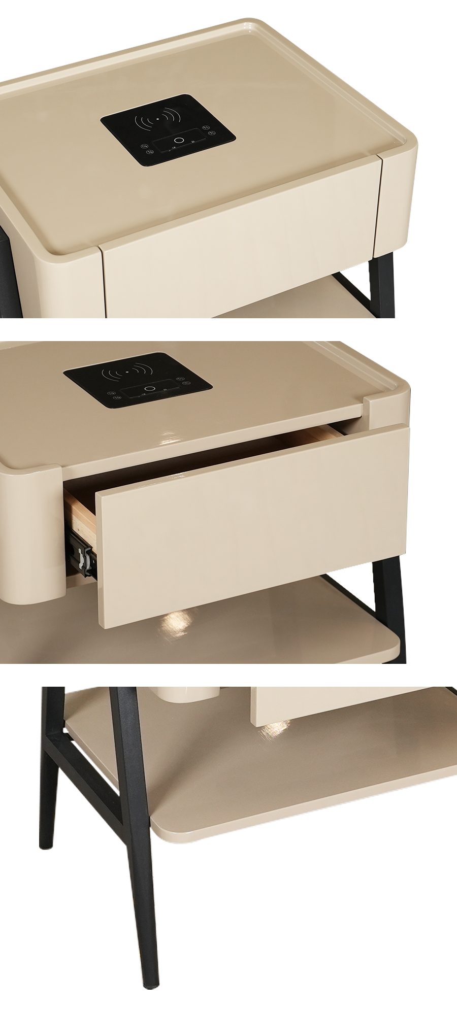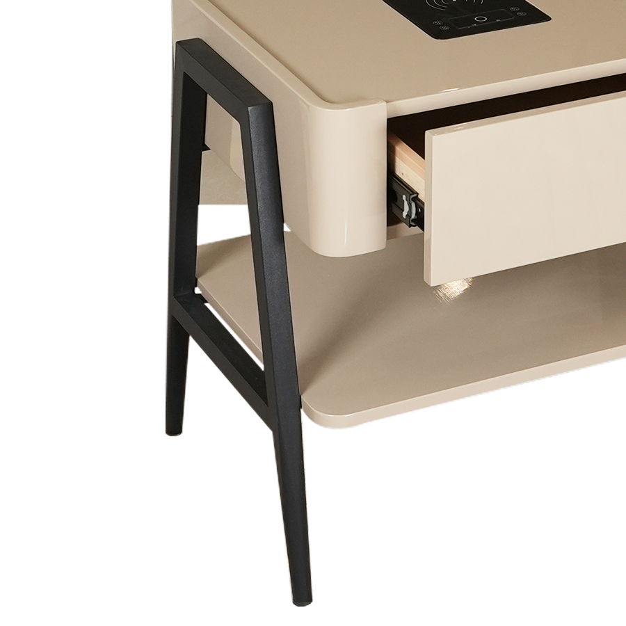 優雅的床頭櫃融合時尚氣息,兼具藍芽音箱、氛圍燈、無線充電、USB充電功能,擁有單抽櫃和獨特支腳設計,為臥室注入高雅與實用。