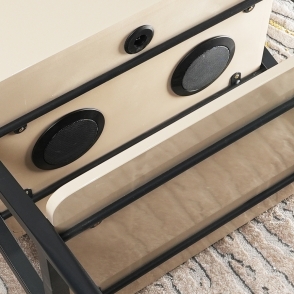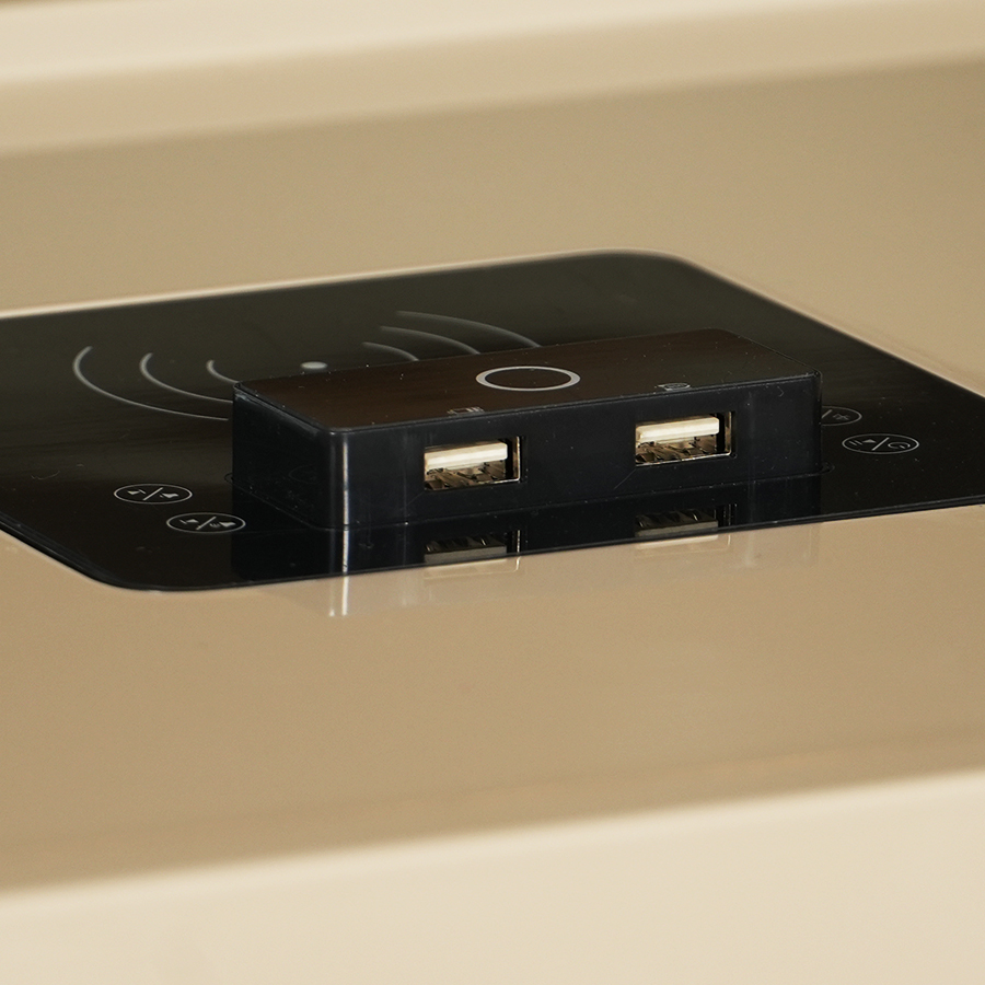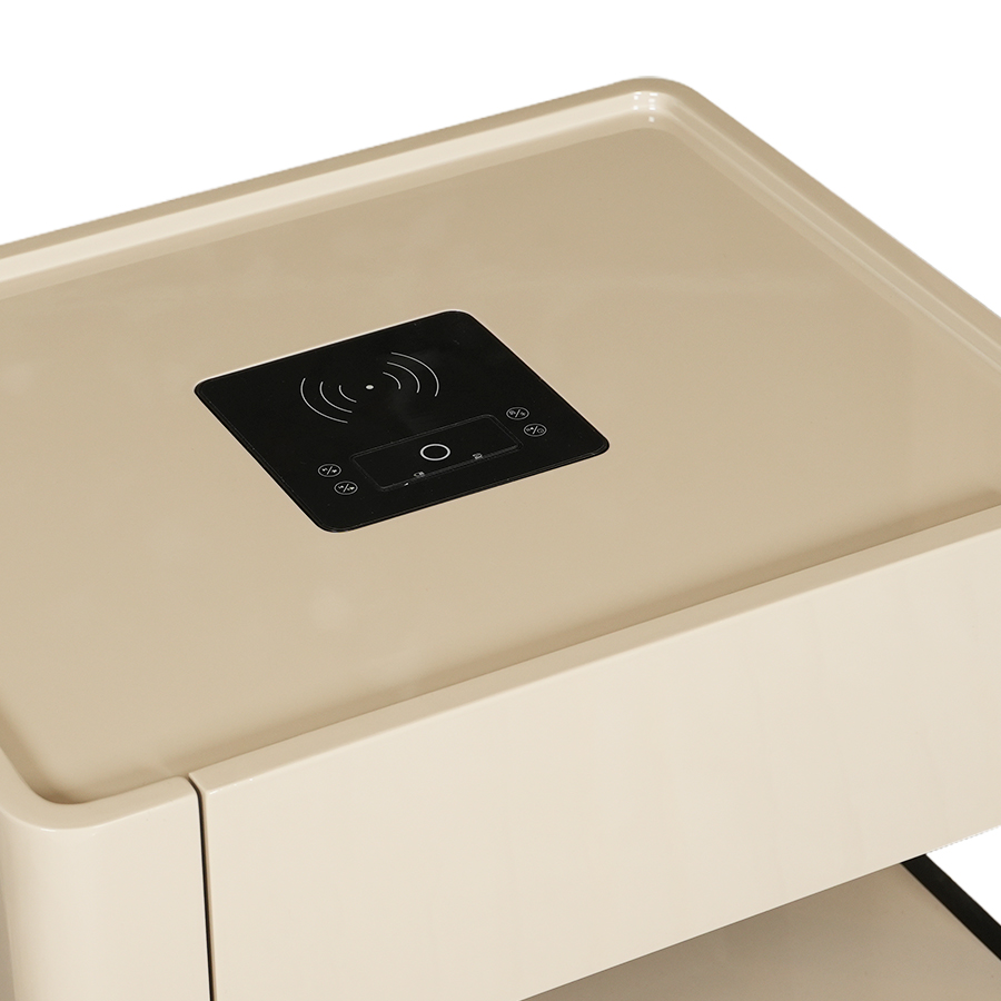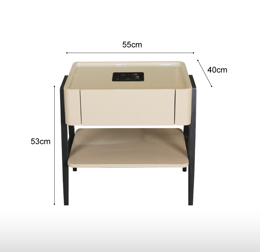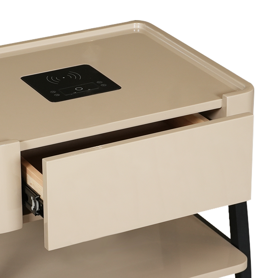 優雅的床頭櫃融合時尚氣息,兼具藍芽音箱、氛圍燈、無線充電、USB充電功能,擁有單抽櫃和獨特支腳設計,為臥室注入高雅與實用。