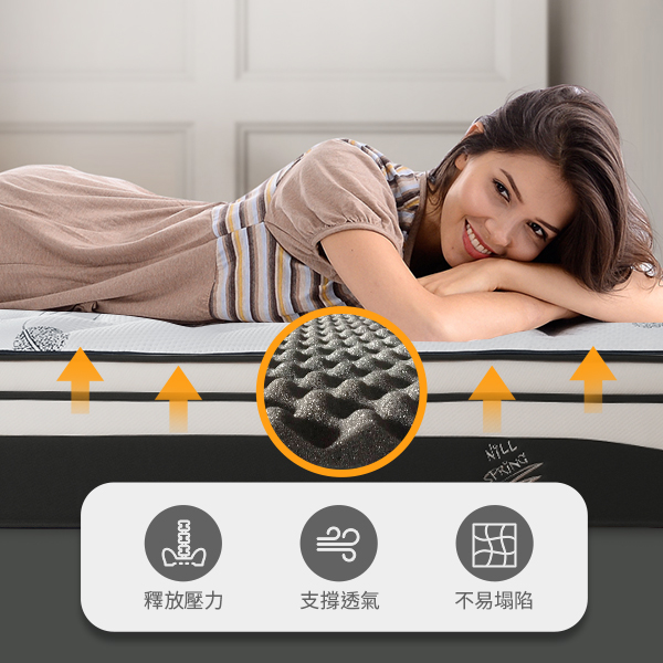 全採用3D高密度支撐型泡棉,導流式設計導入氣流貫穿床墊,透氣涼爽,加強支撐力。無彈簧配置,能減少因摩擦產生噪音翻身不易影響伴侶,給您整晚舒適安靜睡眠。