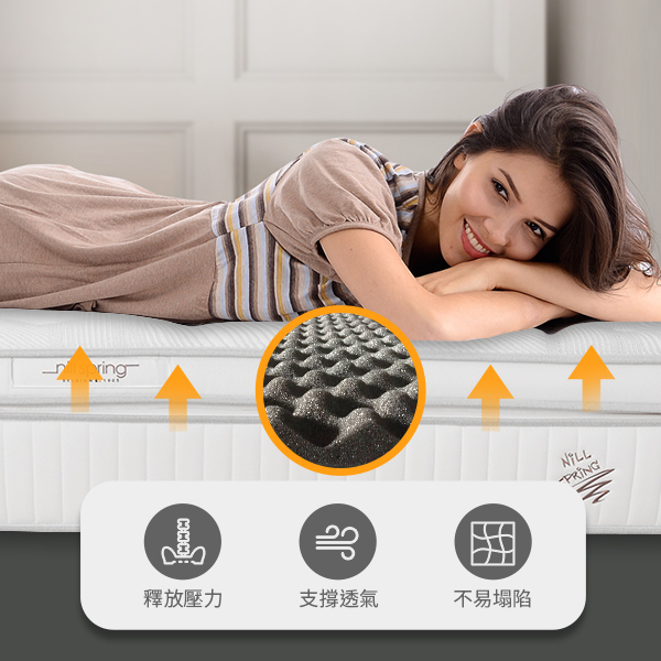 波浪型按摩設計,獨特的分子結構,發揮出更柔軟的舒適性與耐用度,能迅速貼合身形,擁有非常精準撐托力,不同睡姿一樣輕鬆。
