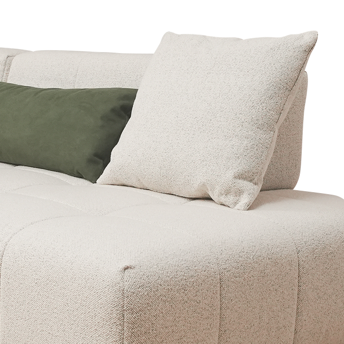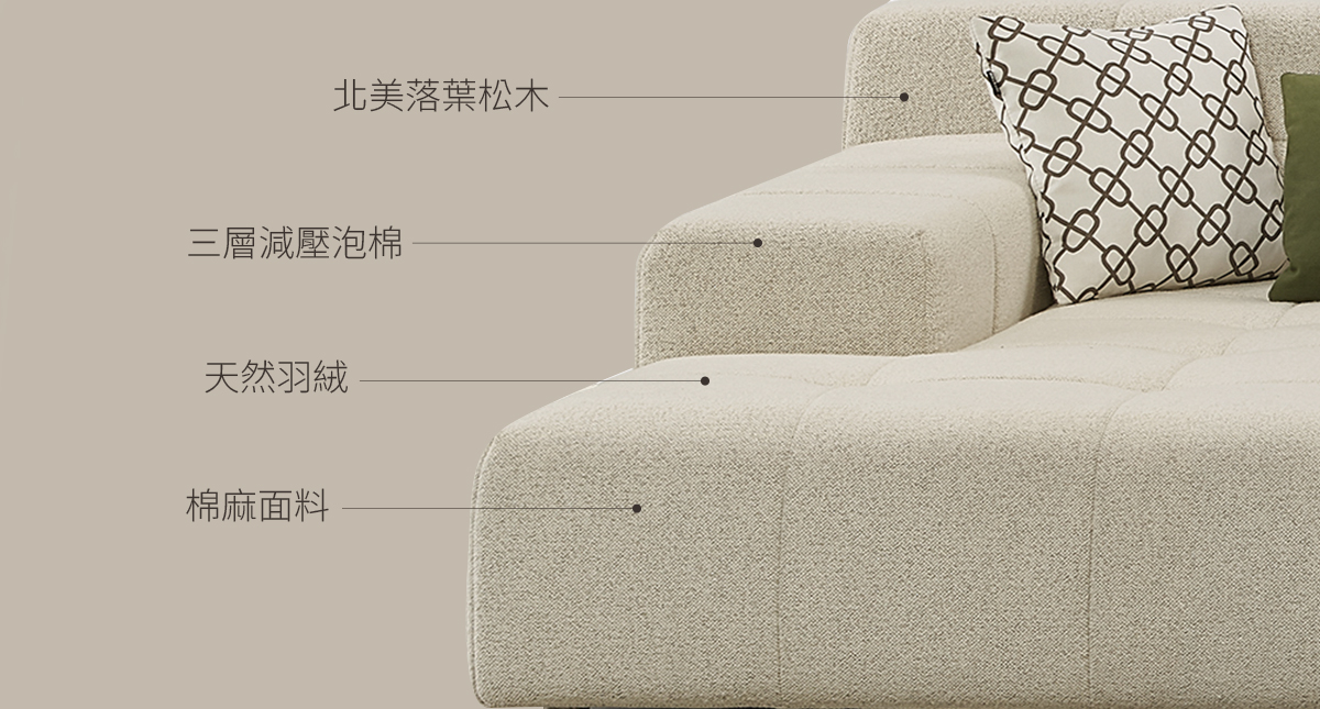 獨立式靠墊設計,可前後移動,具有增加座椅深度的功能,輕巧的羽絨靠墊結構紮實,能夠貼合腰背曲線,提供更為舒適的倚靠感受。每一個靠墊均經過精心設計,充分考慮人體工學,能有效分散壓力,讓您在放鬆時倍感舒適。羽絨材質不僅柔軟輕盈,還擁有極佳的回彈性,長時間倚靠下,都能保持良好的支撐效果。