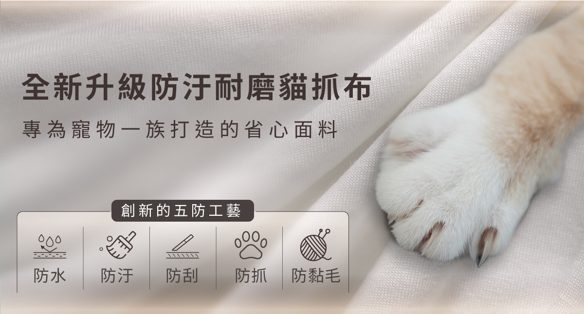 貓抓布2.0版工藝,不僅擁有耐磨耐抓的強力實力,更強化防滲透、防水、防污,搭配立體紋路的高質感設計,與品味生活完美結合。
