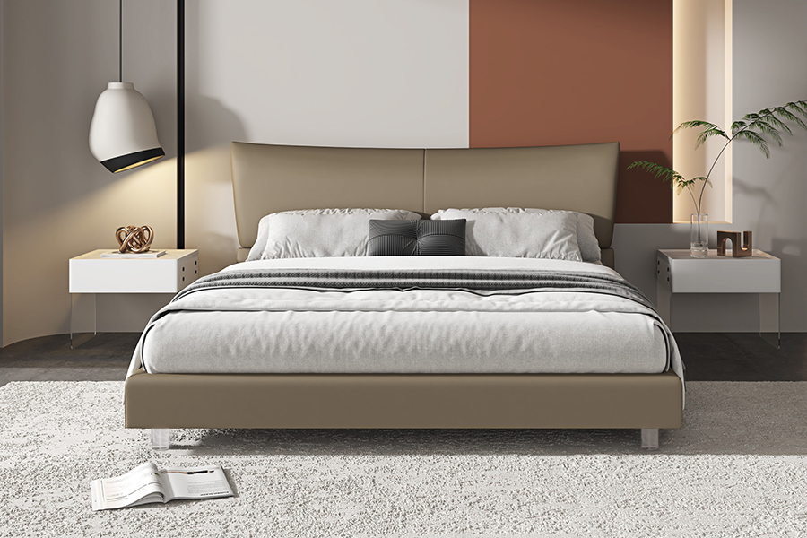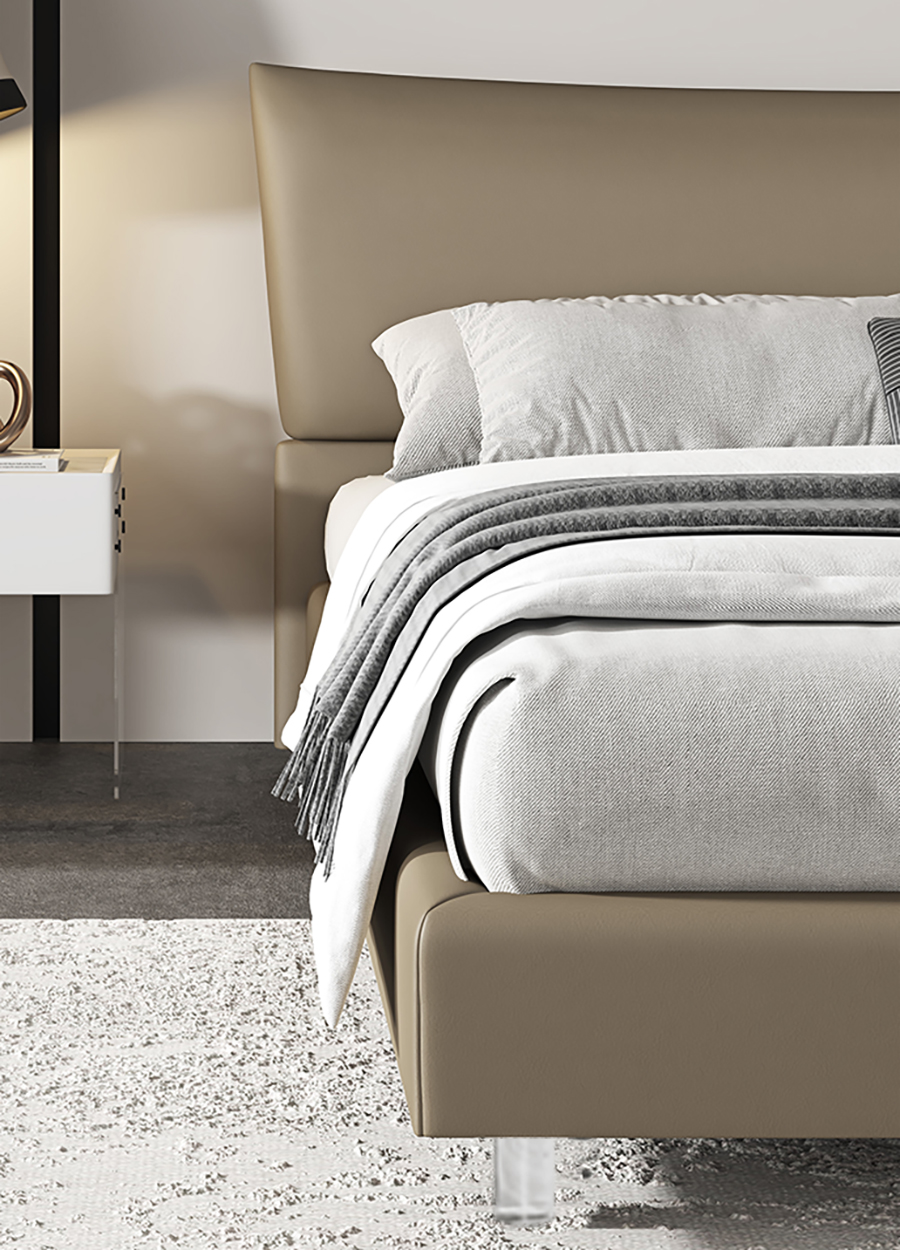 水晶圓柱腳的設計為床架增加獨特質感,彷彿漂浮於空中,帶來輕盈而通透的視覺效果,為臥室注入優雅的現代氛圍,成為臥房中的精緻亮點。