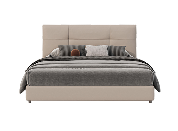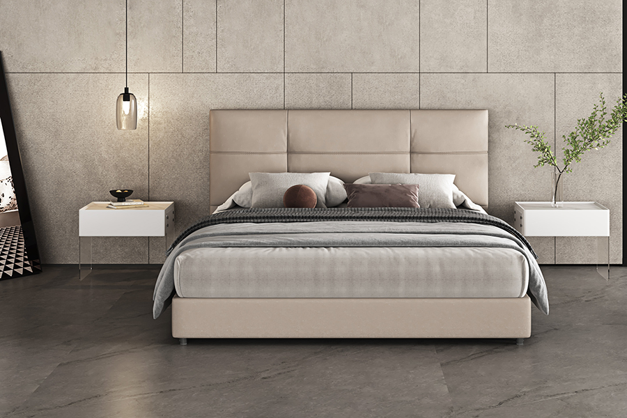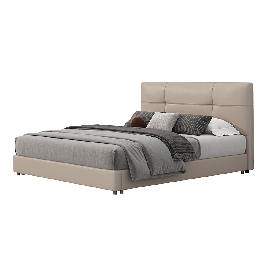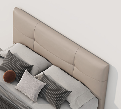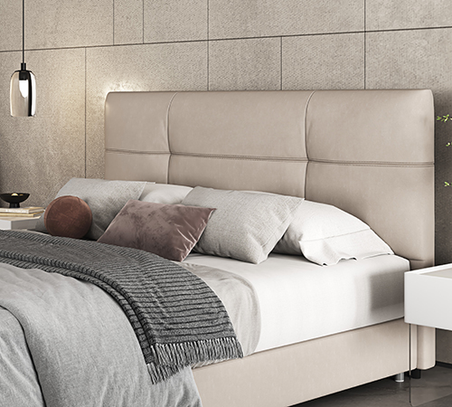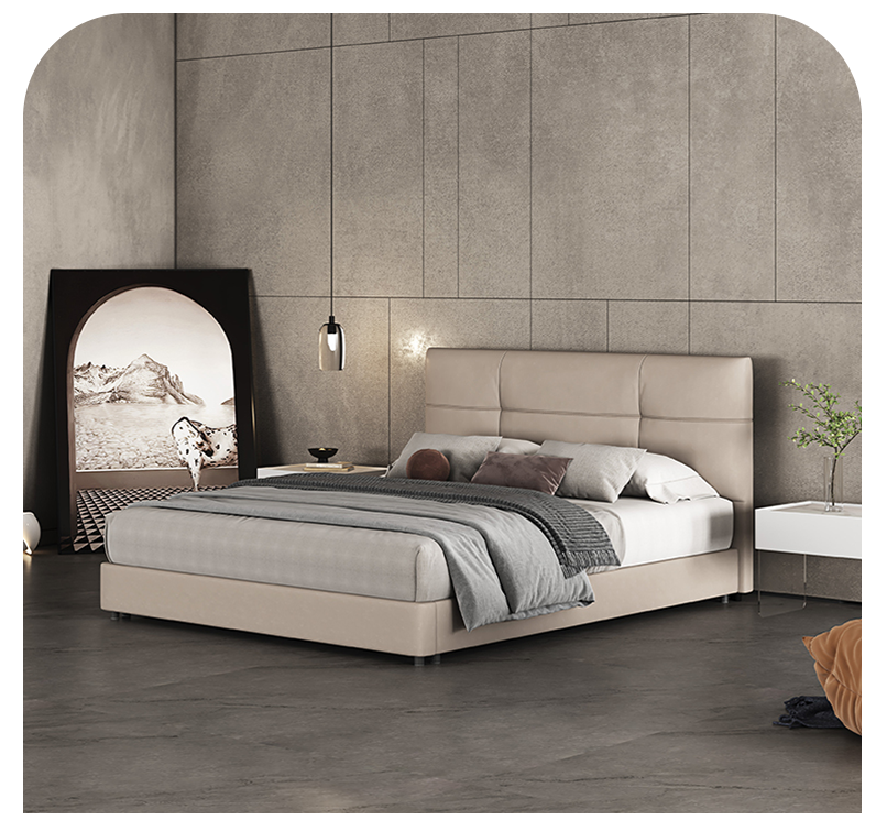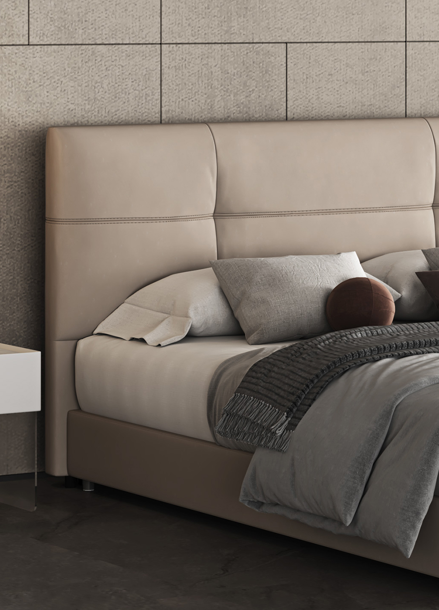 矩形拼接的床頭設計結合了幾何元素與精緻的車縫線, 既符合現代極簡風格,又不失設計亮點,適合各種室內裝潢風格。厚實的床頭軟墊更添舒適感,營造出獨特的現代氣質。