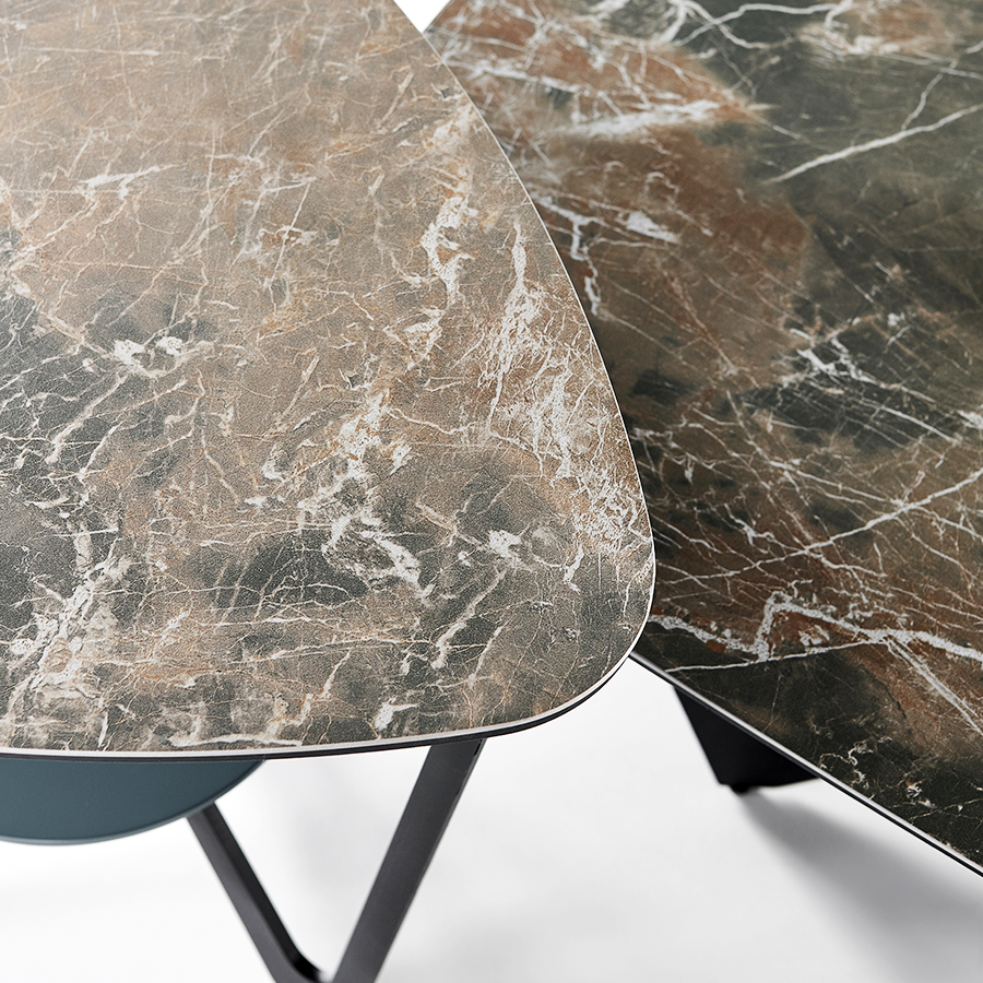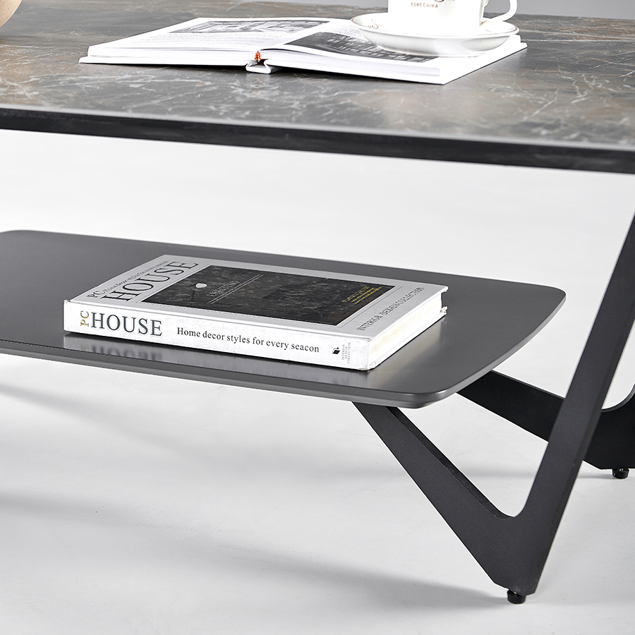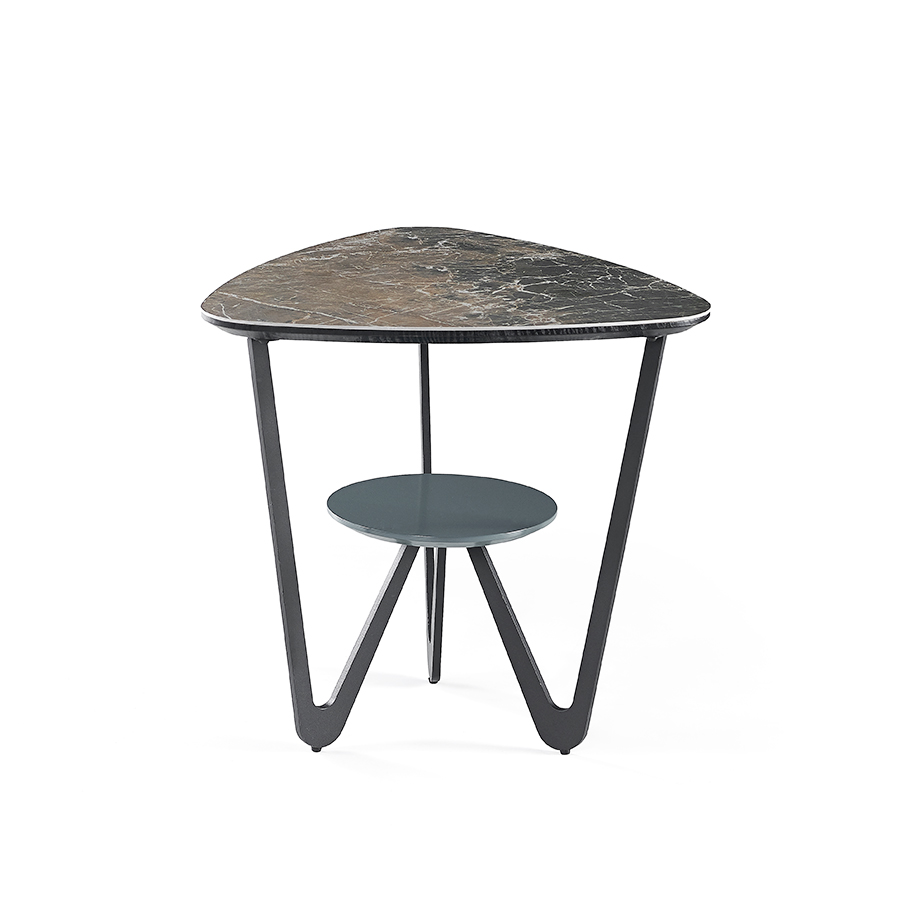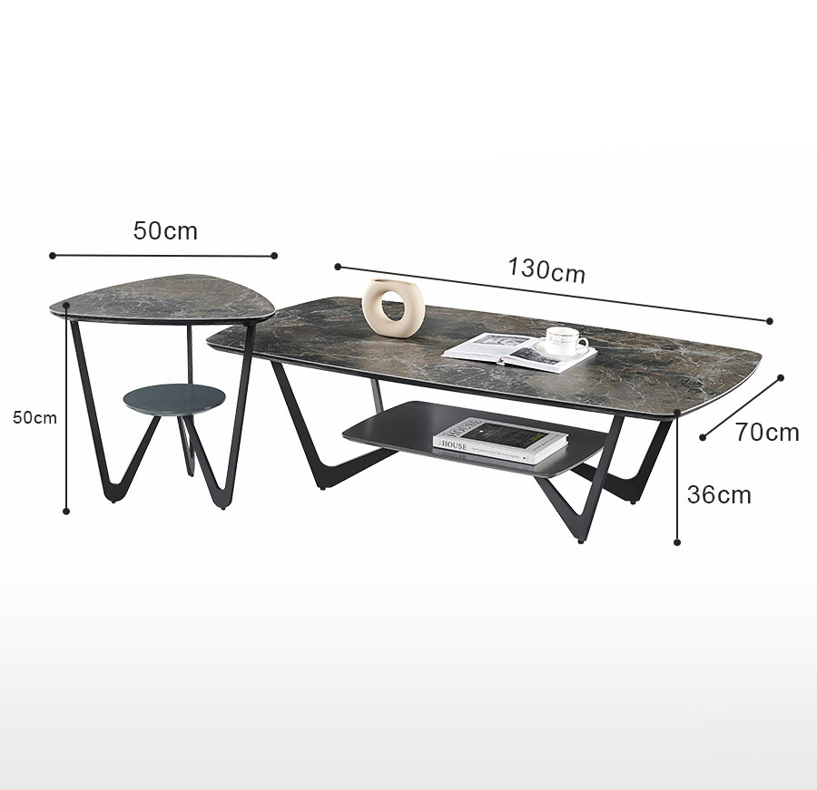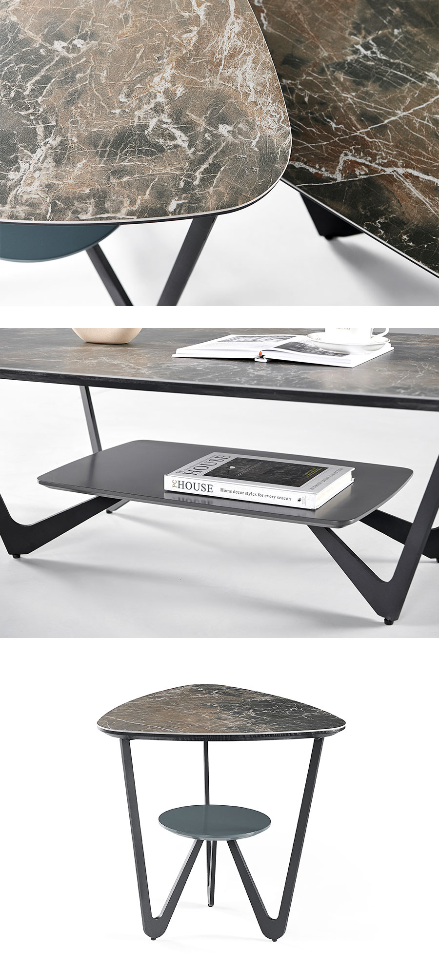 岩板紋自然的紋路,有四個彎曲的腿在底座上支撐著,中間帶有鐵灰色可置物底盤,搭配Elmer愛墨小茶几,體現低調與內斂。
