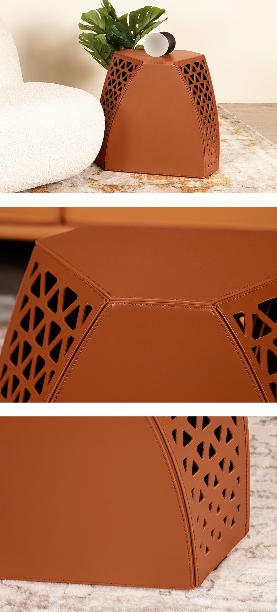 這款邊桌採用精巧的手工製作,完全由真皮製成,採用獨特的六角形設計,視覺上吸睛又時尚。