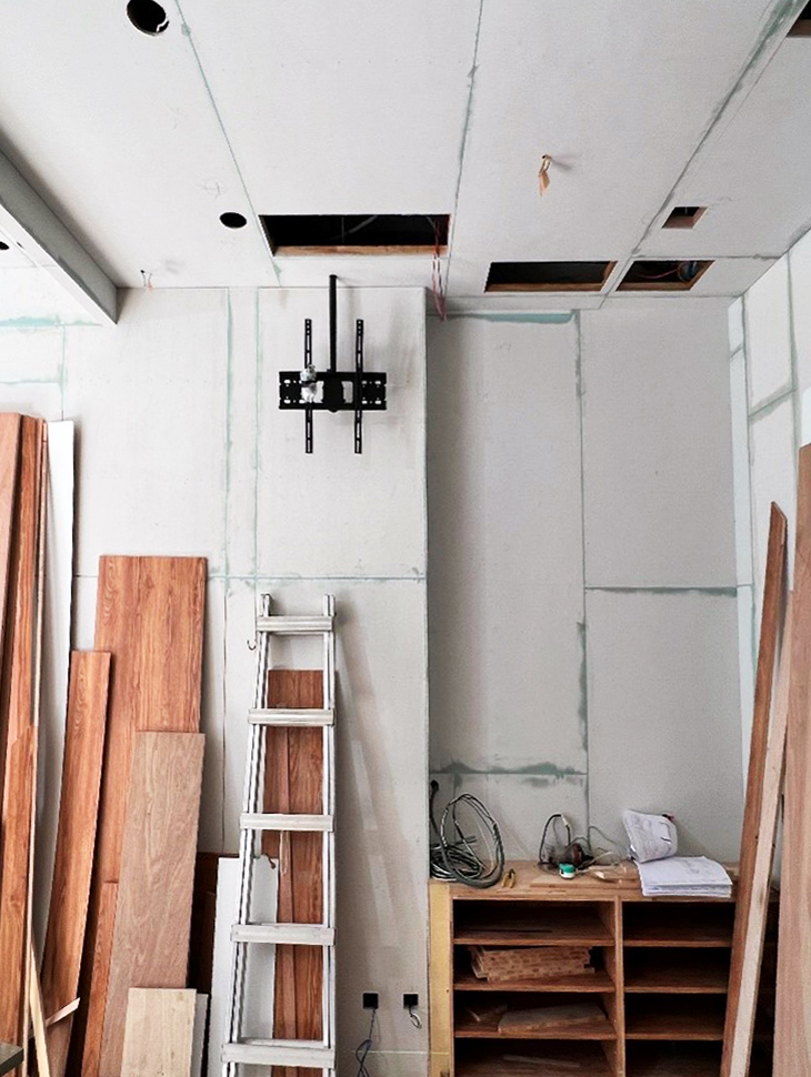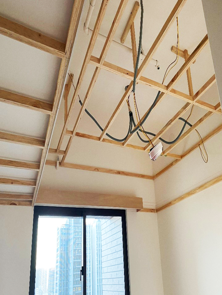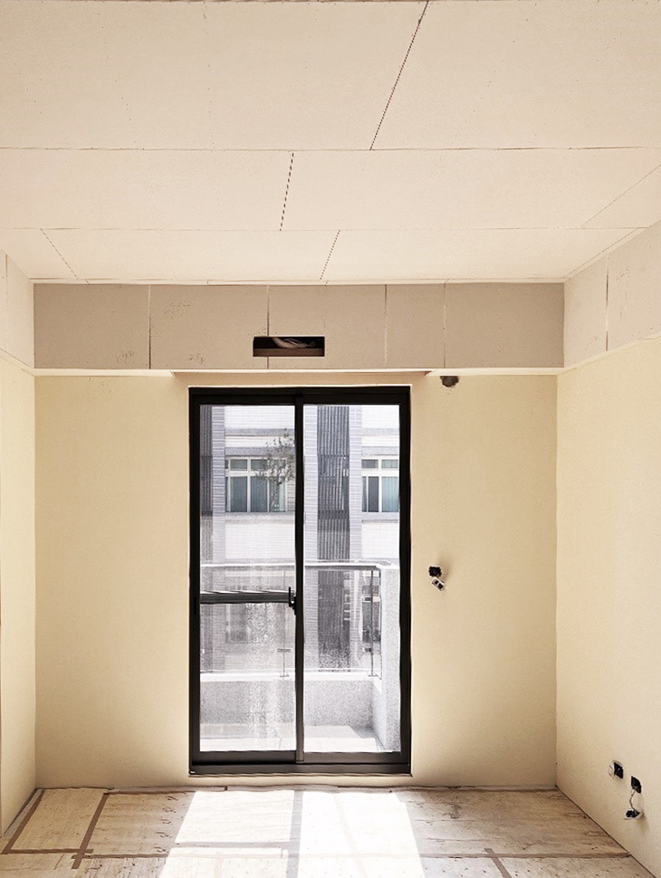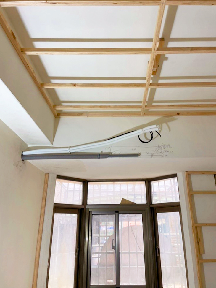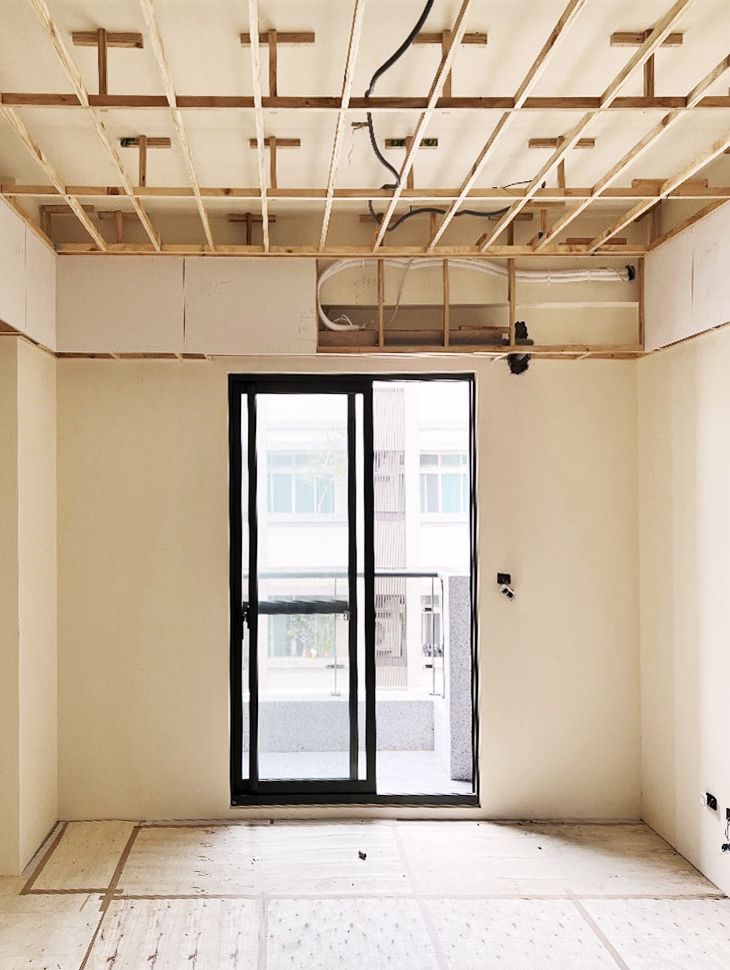 天花板、冷氣包管、木作窗簾盒、電視牆木作底
